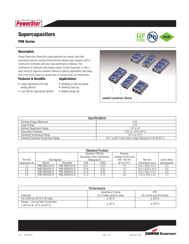 Cap 2.5F 5V -10% to 30% 1000 hr (23 X 21.3 X 11mm) Radial 5.3mm 70°C Bulk