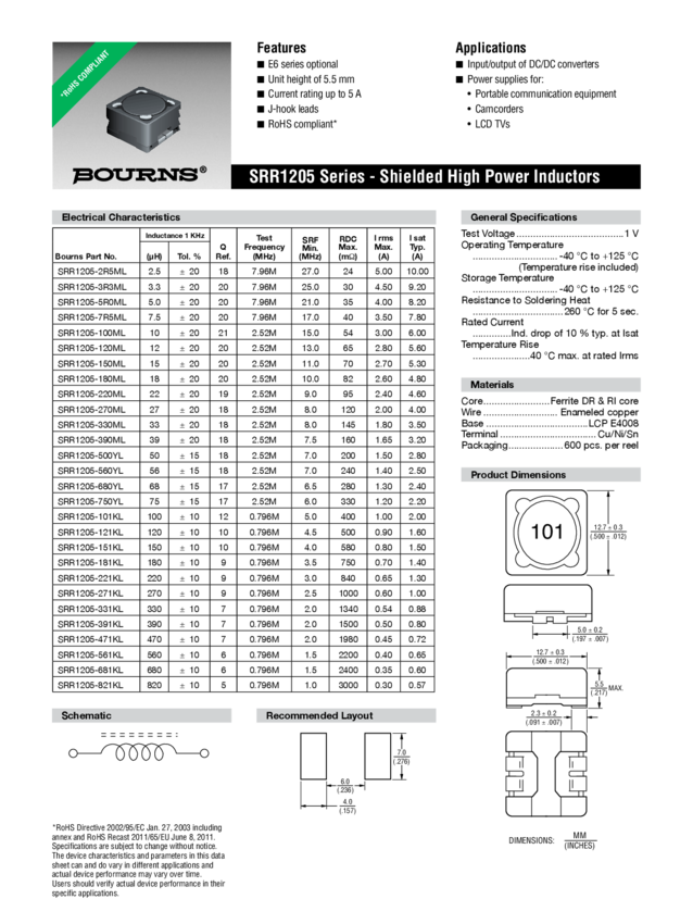 Ind Power Shielded Wirewound 180uH 10% 1KHz 12Q-Factor Ferrite 800mA T/R