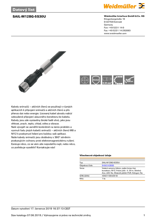 Weidmüller 9456143000 Złącze konfekcjonowane czujnika/aktuatora SAIL-M12BG-5S30U, piny: 5, 30.00 m, 1 szt.