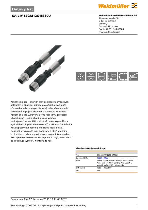 Weidmüller 1058513000 Kabel połączeniowy czujnika/aktuatora SAIL-M12GM12G-5S30U, piny: 5, 30.00 m, 1 szt.