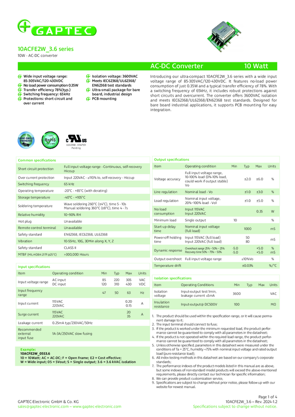 Konwerter AC/DC Gaptec 10ACFE2W_3.6 12.5 V/DC 800 mA 10 W