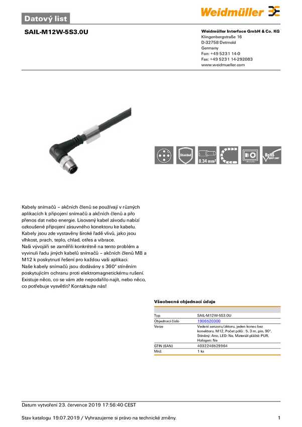 Przewód czujników/elementów wykonawcznych Weidmüller SAIL-M12W-5S3.0Q 1906520300 1 szt.