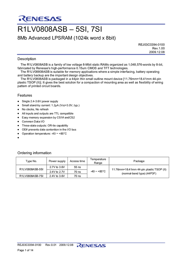 1Mb Advanced LPSRAM (128k word x 8bit)