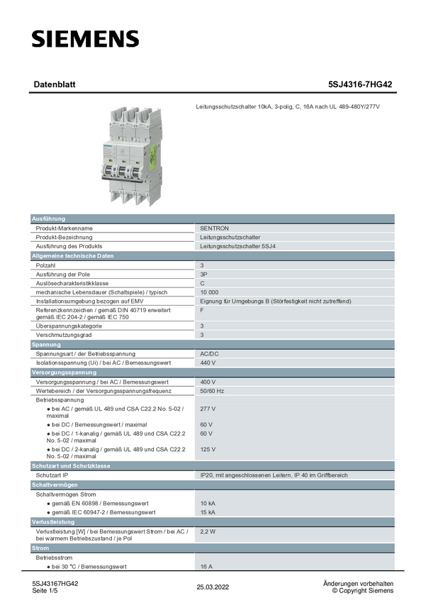 Wyłącznik automatyczny Siemens 5SJ4316-7HG42 5SJ43167HG42, 400 V, 16 A