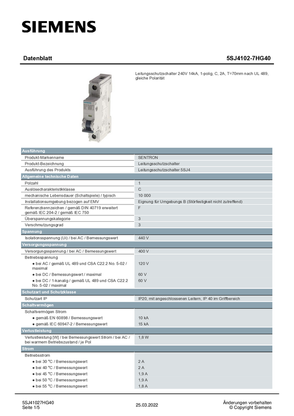 Siemens 5SJ41027HG40 5SJ4102-7HG40 Wyłącznik automatyczny 2 A 230 V, 400 V