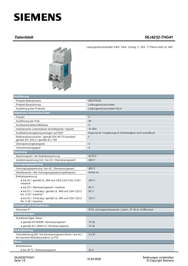 Siemens 5SJ41107HG41 5SJ4110-7HG41 Wyłącznik automatyczny 10 A 230 V, 400 V