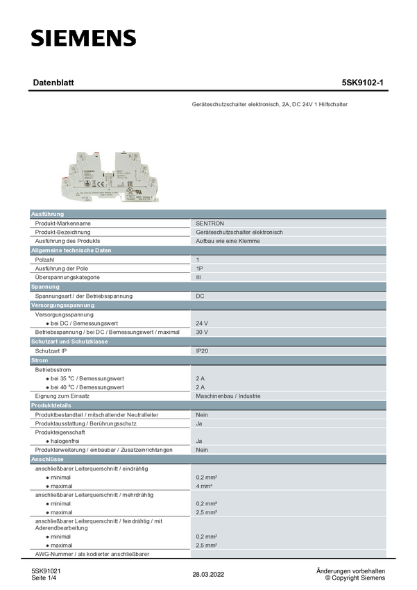 Siemens 5SK91021 5SK9102-1 Wyłącznik automatyczny 30 V/DC 2 A 1 szt.