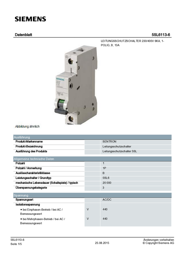 Wyłącznik instalacyjny Siemens LS-SCHALTER 6KA, B 1 bieg 13