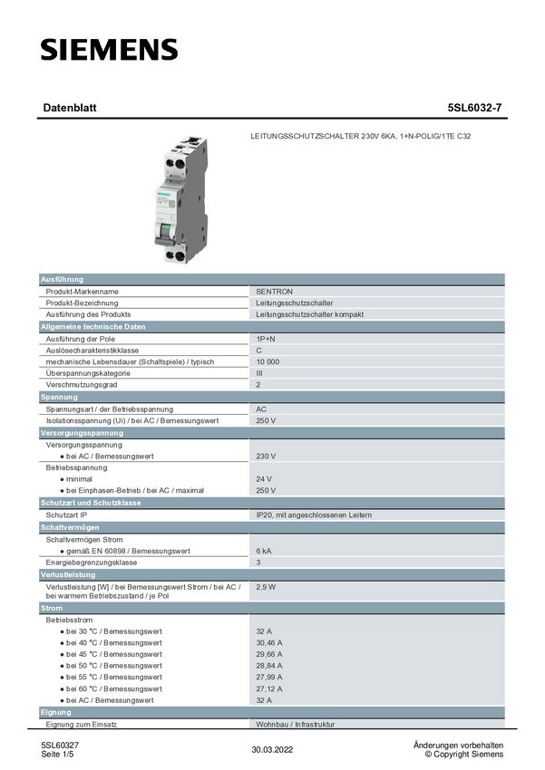Siemens 5SL60327 5SL6032-7 Wyłącznik automatyczny 32 A