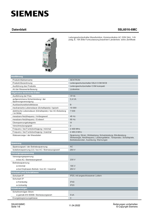 Siemens 5SL41166 Siemens Dig.Industr. Wyłącznik automatyczny 1 styk 16 A 230 V, 400 V