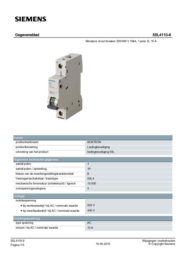 Wyłącznik automatyczny Siemens Siemens Dig.Industr. 5SL41106, 1 styk, 230 V, 400 V, 10 A
