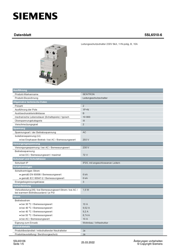 Wyłącznik automatyczny Siemens 5SL6510-6 5SL65106, 230 V, 10 A