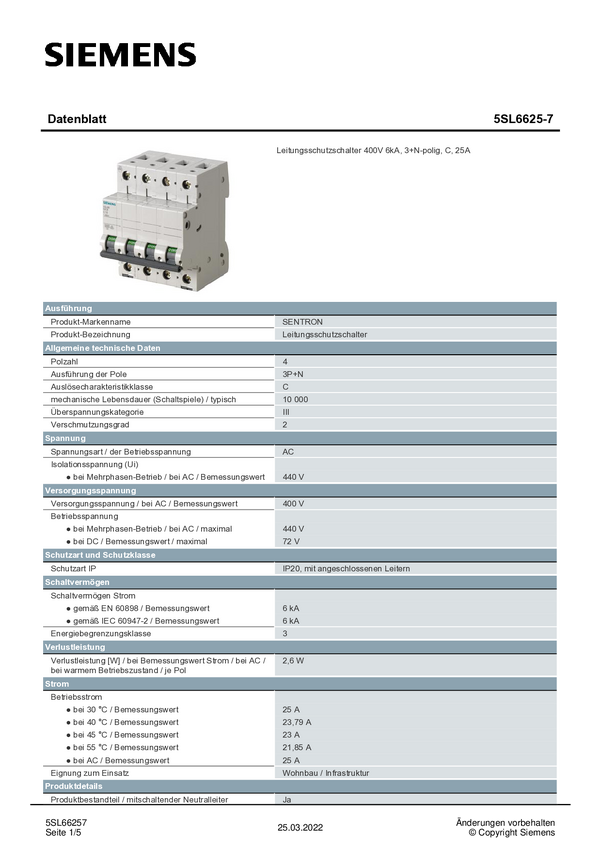 Wyłącznik automatyczny Siemens 5SL6625-7 5SL66257, 400 V, 25 A