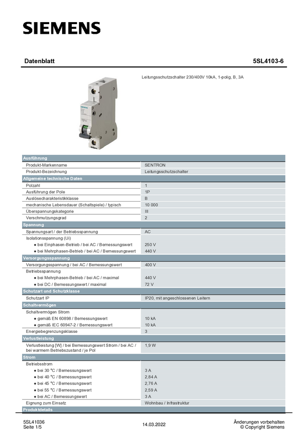 Siemens 5SL41036 5SL4103-6 Wyłącznik automatyczny 1 styk 3 A 230 V, 400 V