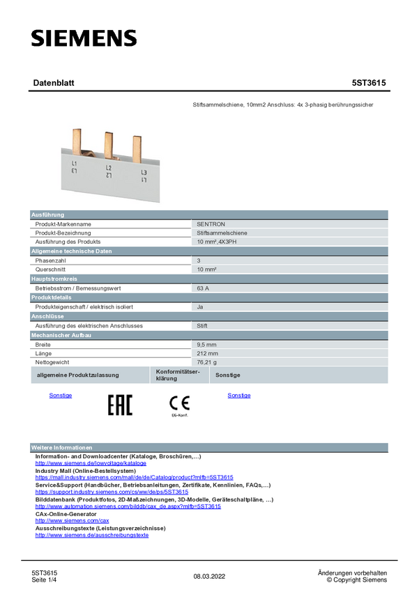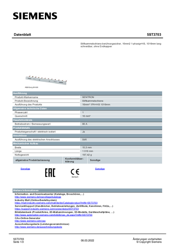 Szyna zbiorcza Siemens 5ST3703, 80 A