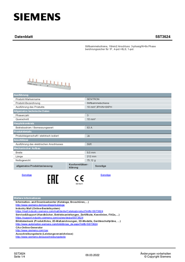 Szyna zbiorcza Siemens 5ST3624, 63 A