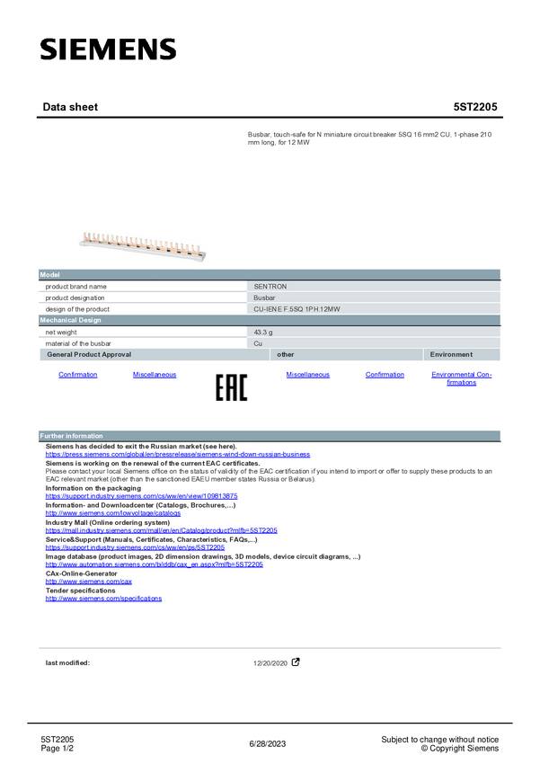 Szyna magistrali Siemens 5ST2205 210 mm 1 szt.