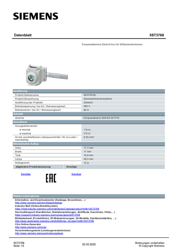 Zacisk wejściowy Siemens 5ST3768