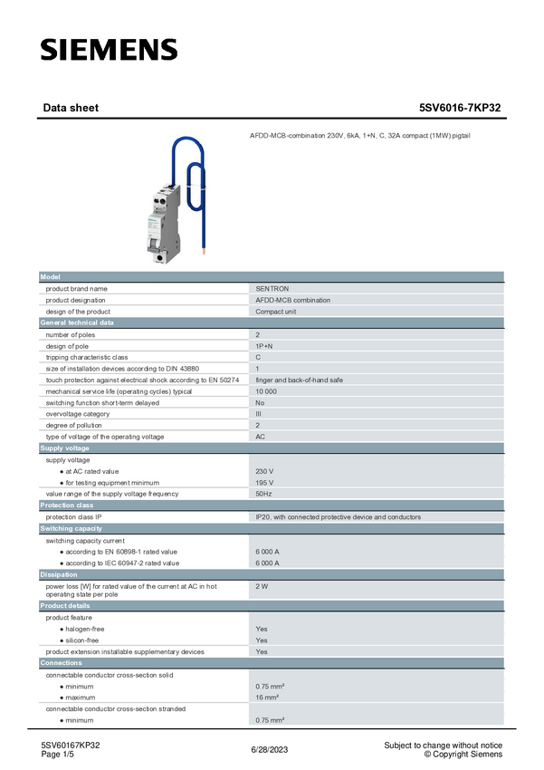 Przełącznik ochrony przeciwpożarowej Siemens 5SV6016-7KP13 5SV60167KP13