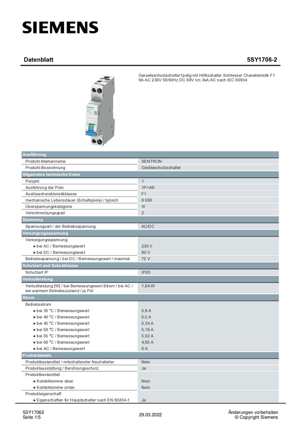 Siemens 5SY17062 5SY1706-2 Wyłącznik automatyczny plombowany 72 V/DC 6 A 1 szt.
