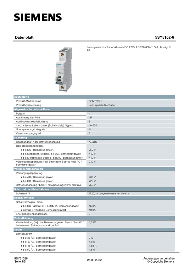Wyłącznik automatyczny Siemens 5SY5102-6 5SY51026, 230 V, 400 V, 2 A