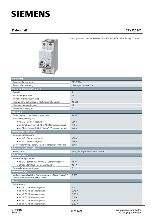 Wyłącznik automatyczny Siemens 5SY5204-7 5SY52047, 230 V, 400 V, 4 A
