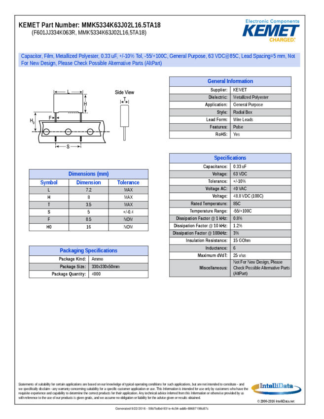 Cap Film 0.33uF 63V PET 10% (7.2 X 3.5 X 8mm) Radial 5mm 100°C Ammo Pack