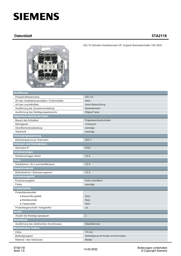 Siemens Osprzęt elektroinstalacyjny Przełącznik do żaluzji Delta 5TA21170KK 10 szt.
