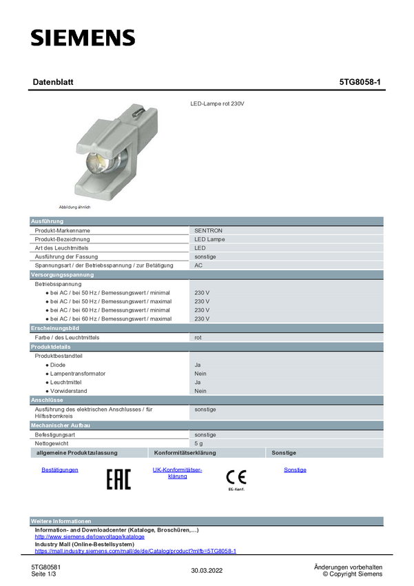 Siemens 5TG8058-1 Dioda LED czerwony 230 V/AC 5 szt.
