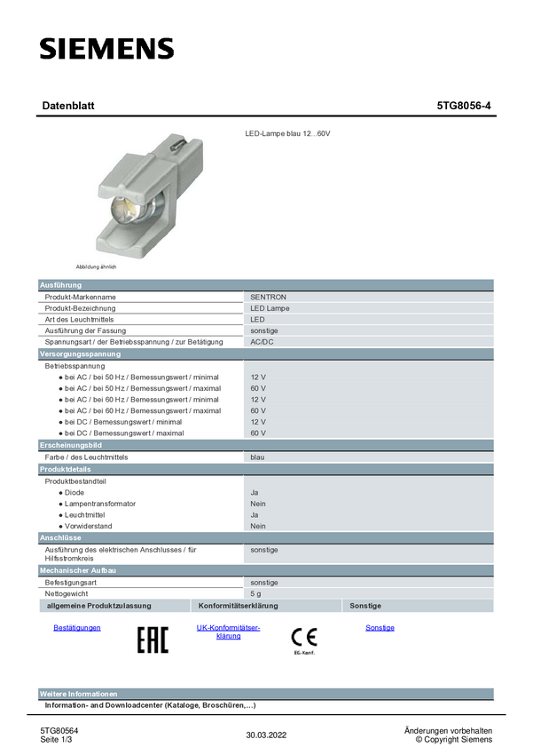 Siemens 5TG8056-4 Dioda LED niebieski 60 V DC/AC 5 szt.