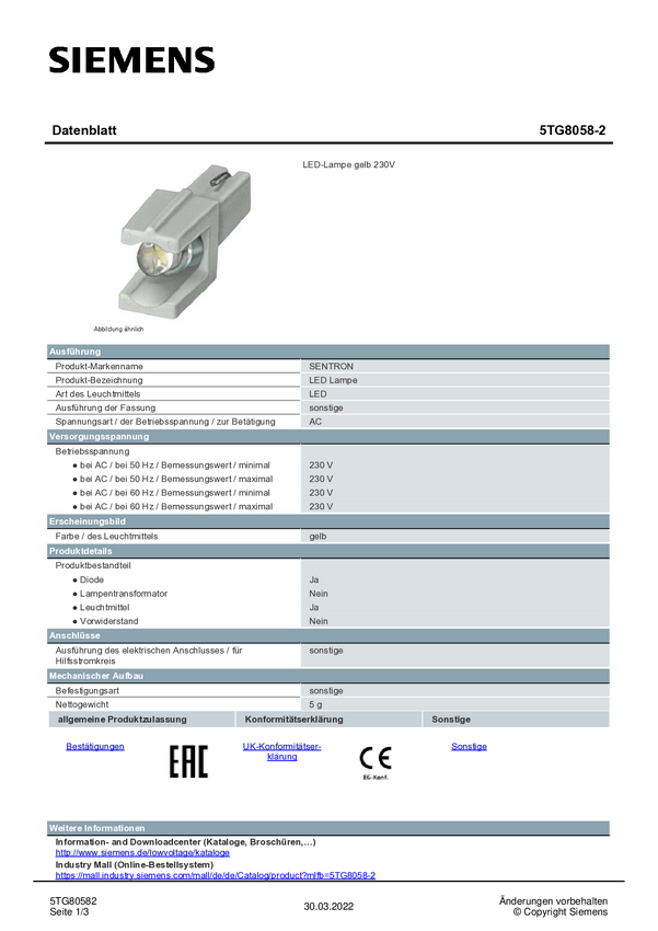 Siemens 5TG8058-2 Dioda LED żółty 230 V/AC 5 szt.