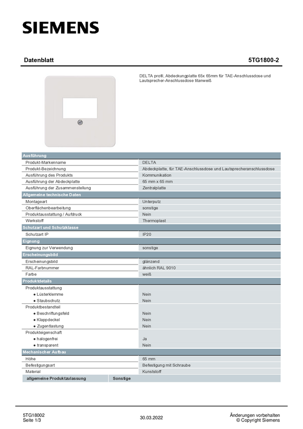 Siemens Osprzęt elektroinstalacyjny Osłona Delta biały 5TG18002 1 szt.