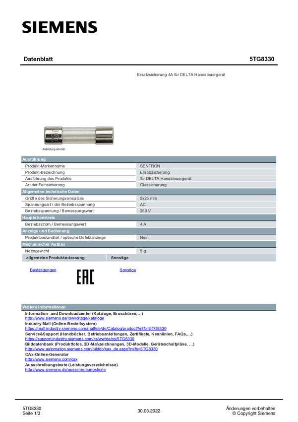 Siemens 5TG8330 5TG8330 Bezpiecznik (Ø x D) 5 mm x 25 mm 4 A 250 V/AC Zawartość 1 szt.
