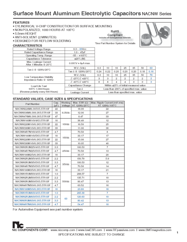 NIC Components NACEW220M35V6.3X5.5TR Kondensator elektrolityczny 1 szt.