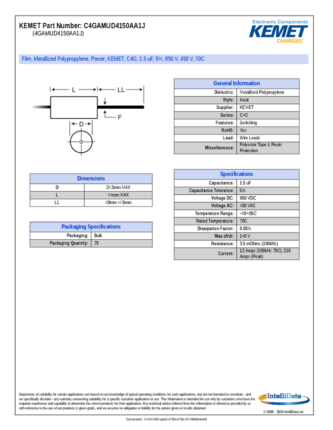 Cap Film 1.5uF 850V 5% (24.5 X 44mm) Axial 0.0035 Ohm 85°C