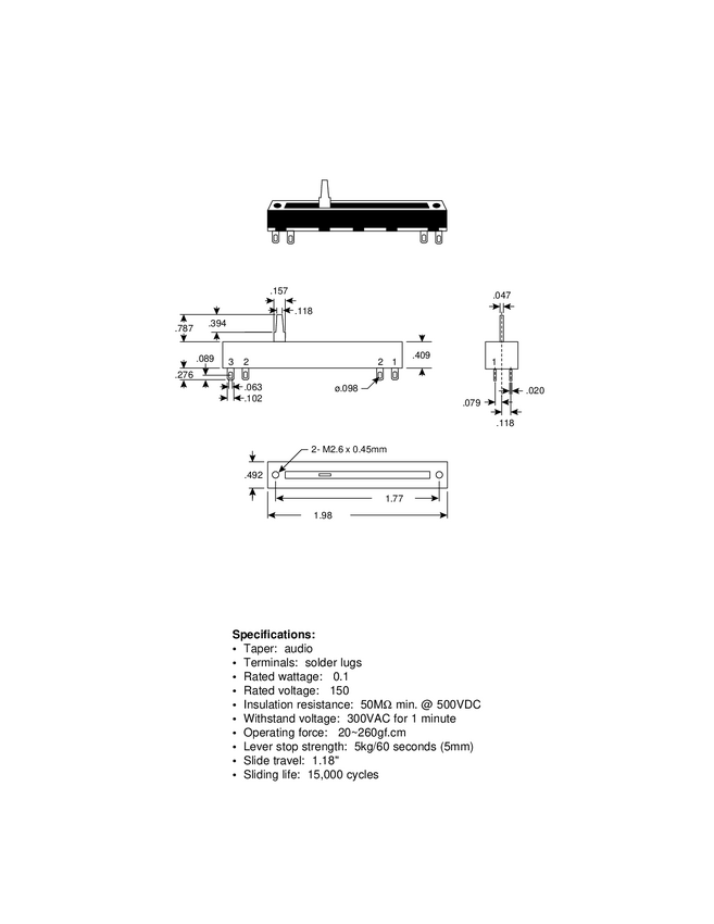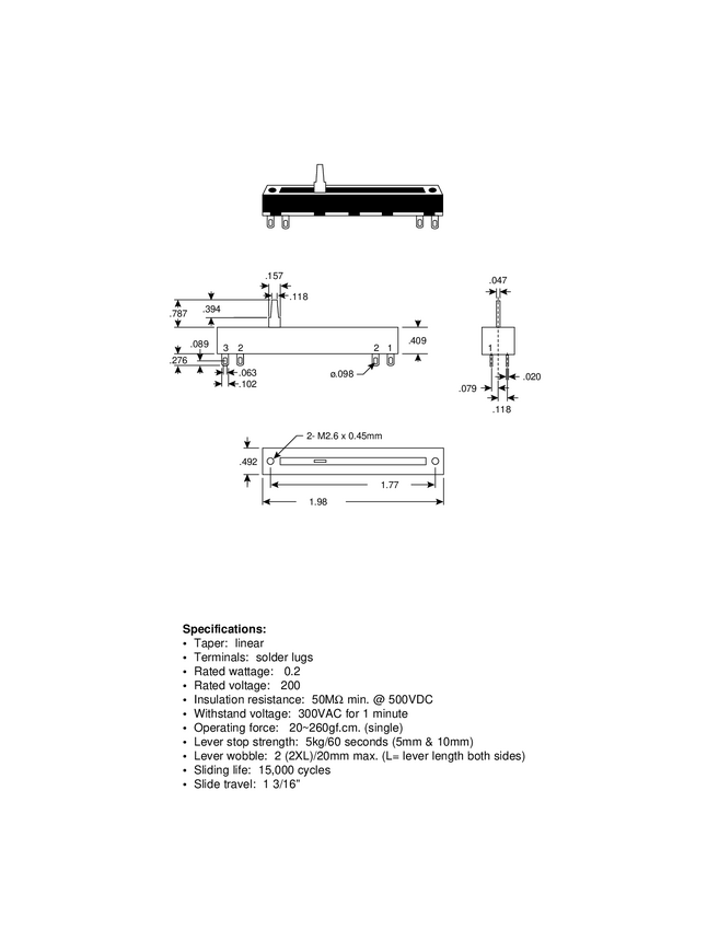 Potencjometr suwakowy travel 30mm;wym:50,3x12,5x10mm śr.45mm Rozstaw pinów 5mm;??mm; wodzik plastyk wys.20x4x2mm trwałość 15.000 cykli; moc 0,1W; tylko mono