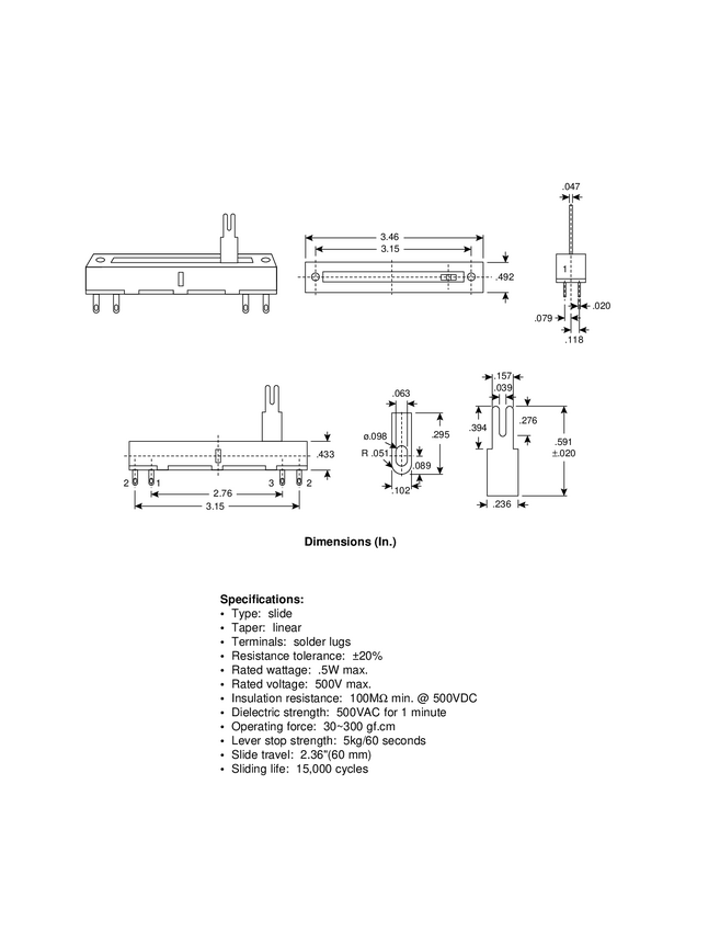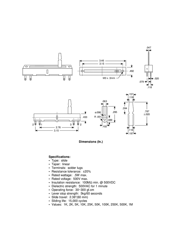 Potencjometr suwakowy travel 60mm;wym.:88x12,5x11mm; śr.80mm Wodzik metalowy 20x5x1,2mm; 0,5W Liniowy 1,2,5,10,25,50,100,250,500k,1m