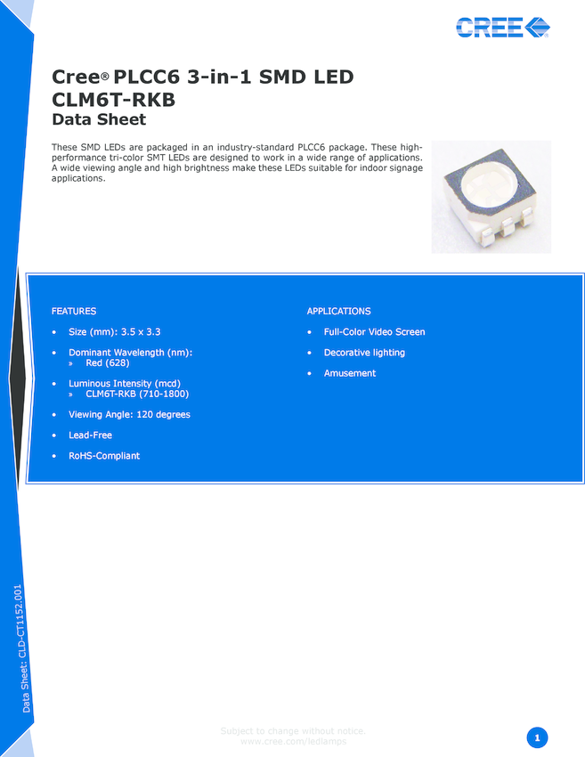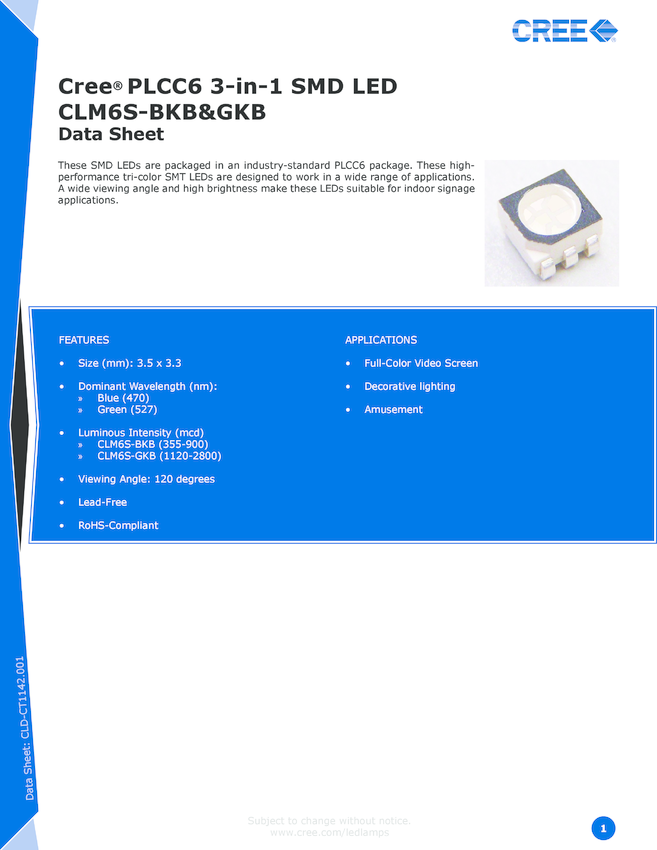 LED CREE CLM6S-BKB PLCC6, , 3x20mA, 3.5x3.3mm, selekcja: CTbVa363 /355 - 900mCd; B3-B6/, ROHS