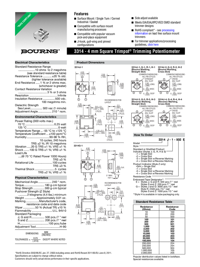 Potencjometr; 100kOhm; 250mW; montażowy; jednoobrotowy,leżący; 4,5x4,5x2,55mm; SMD; 3314J-1-104E; BOURNS; RoHS