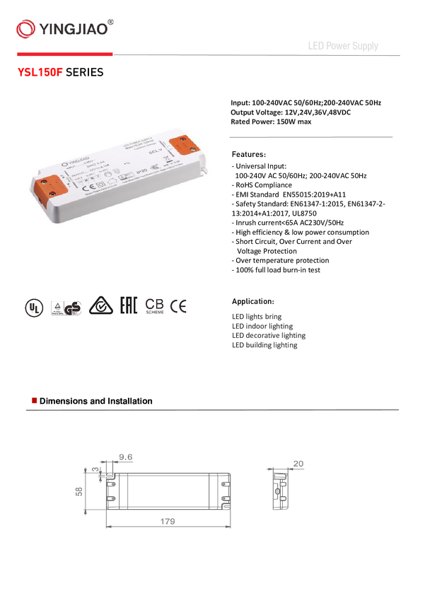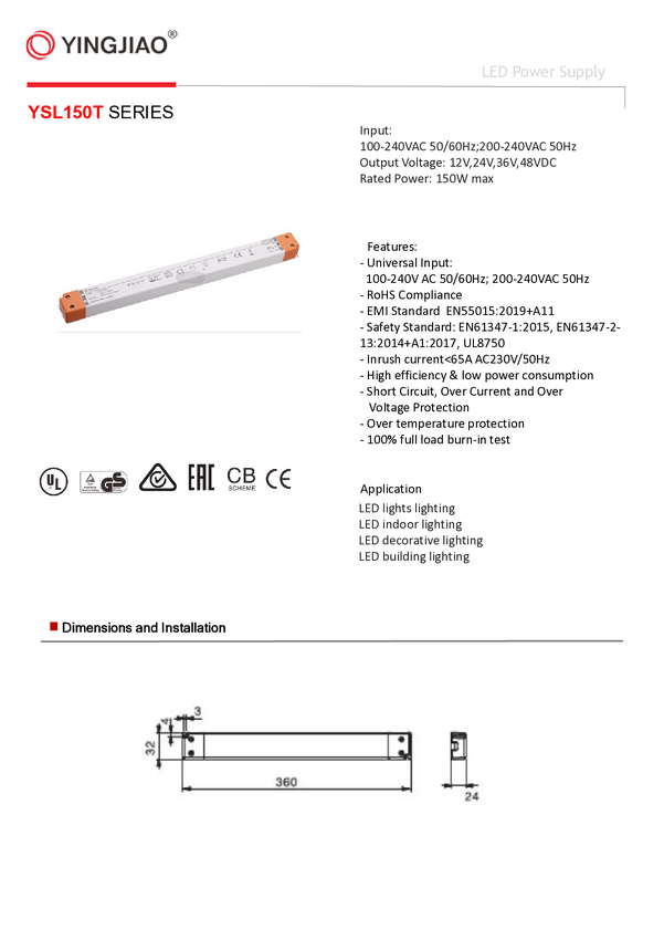 Zasilacz do oświetlenia LED 24V 6,25A 150W YINGJIAO | YSL150F-2406250