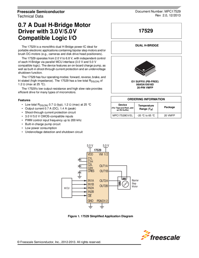 MPC17529: Dual H-Bridge, Motor Driver, 2-6.8V, 1.4A, 200kHz