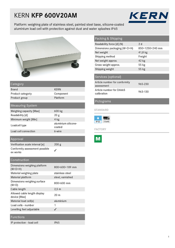 Platforma KFP 600V20AM, zakres ważenia 600 kg, dokładność odczytu 20 g Kern KFP 600V20AM
