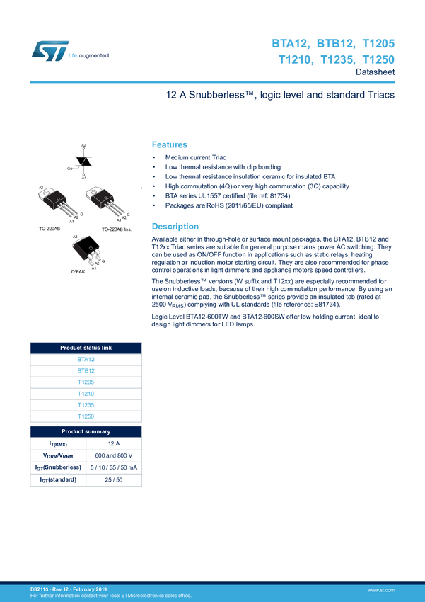 TRIAC STMicroelectronics BTA12-600BWRG, 1 szt.