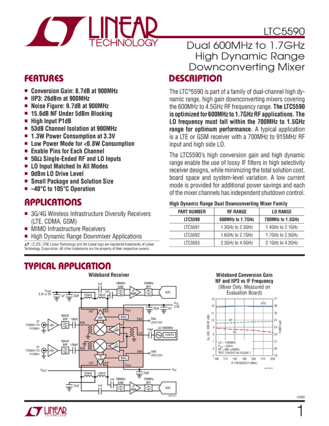 600MHz to 1.3GHz High Dynamic Range Downconverting Mixer