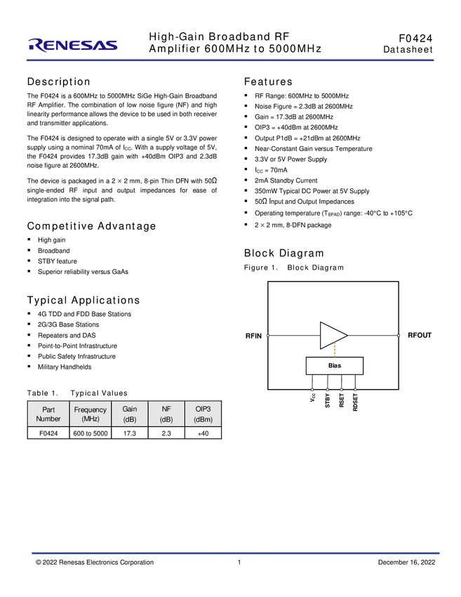 Evaluation Board for F0424 Broadband RF Amplifier 600MHz to 4200MHz