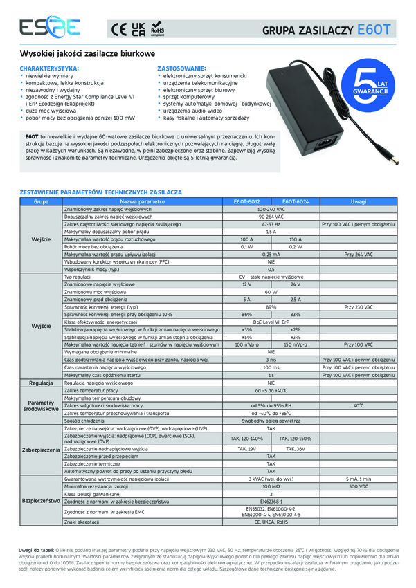 Zasilacz desktop ESPE 24V 2,5A 60W | E60T-6024