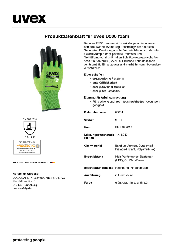 uvex D500 foam 6060409 Rękawice chroniące przed przecięciem Rozmiar rękawic: 9 EN 388 1 par(a)