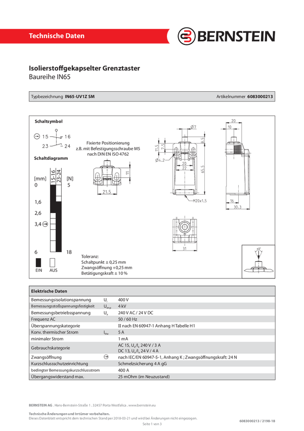 Przełącznik pozycyjny Bernstein IN65-UV1Z SM 6083000213, 240 V/AC, 5 A, IP66/IP67, 5 szt.