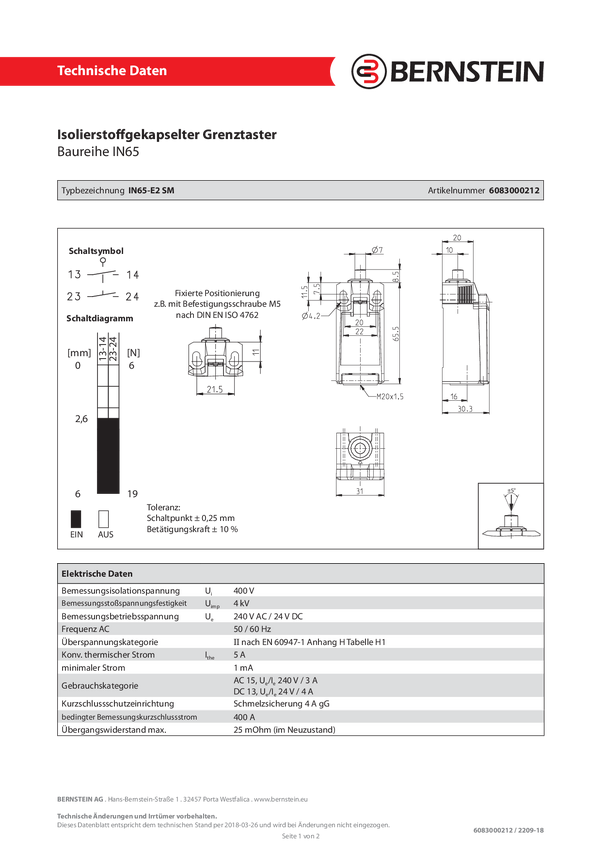 Przełącznik pozycyjny Bernstein IN65-E2 HK 6083000226, 240 V/AC, 5 A, IP66/IP67, 5 szt.
