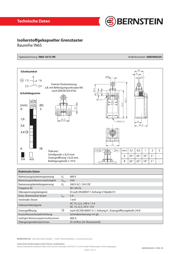 Przełącznik pozycyjny Bernstein IN65-UV1Z RK 6083000220, 240 V/AC, 5 A, IP66/IP67, 5 szt.